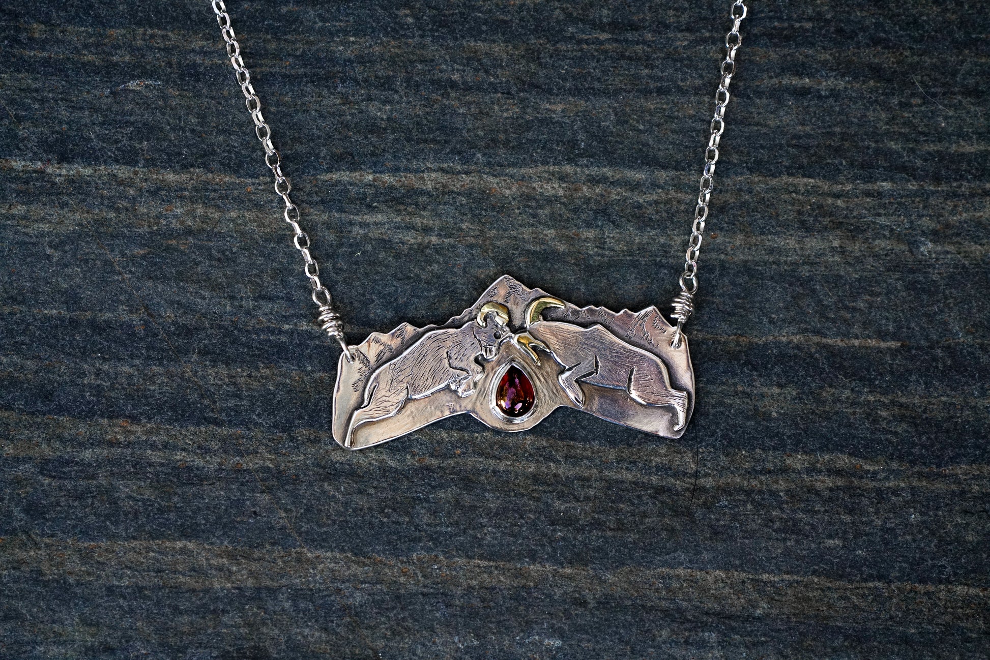This big horn sheep necklace is handmade from sterling silver and features a garnet stone. These sheep started out as simple sterling silver wire & sheet from which I sawed out and assembled multiple layers - including brass horn details. Then I added little details through stamping, engraving, sawing, drilling and patina to bring each one to life.
