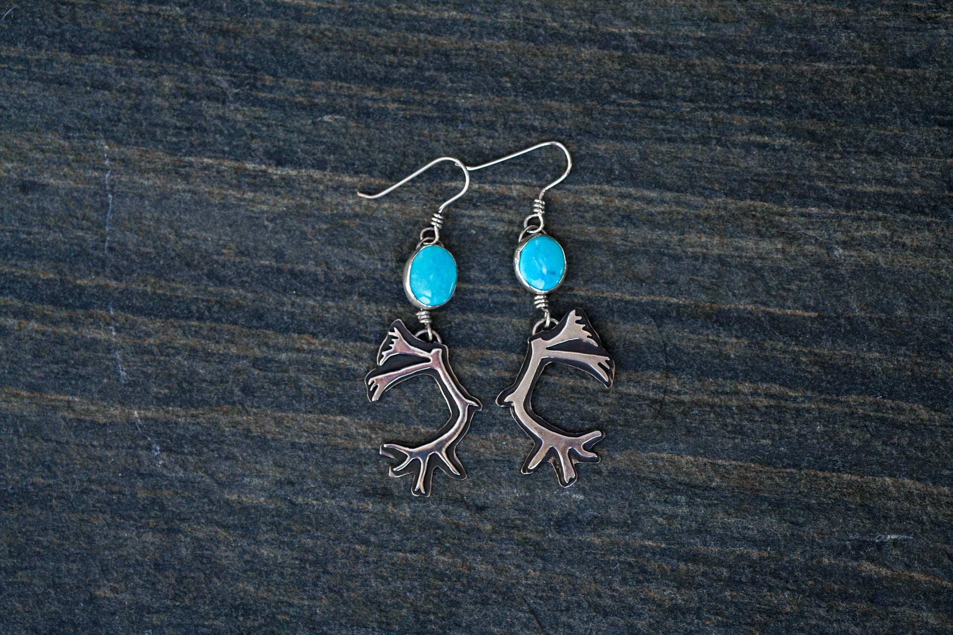 These caribou antler earrings are handmade from sterling silver and feature Blue Ridge Turquoise stones. Each antler starts out as simple sterling silver wire & sheet from which I saw out and assemble multiple layers, then add a patina to make them pop.