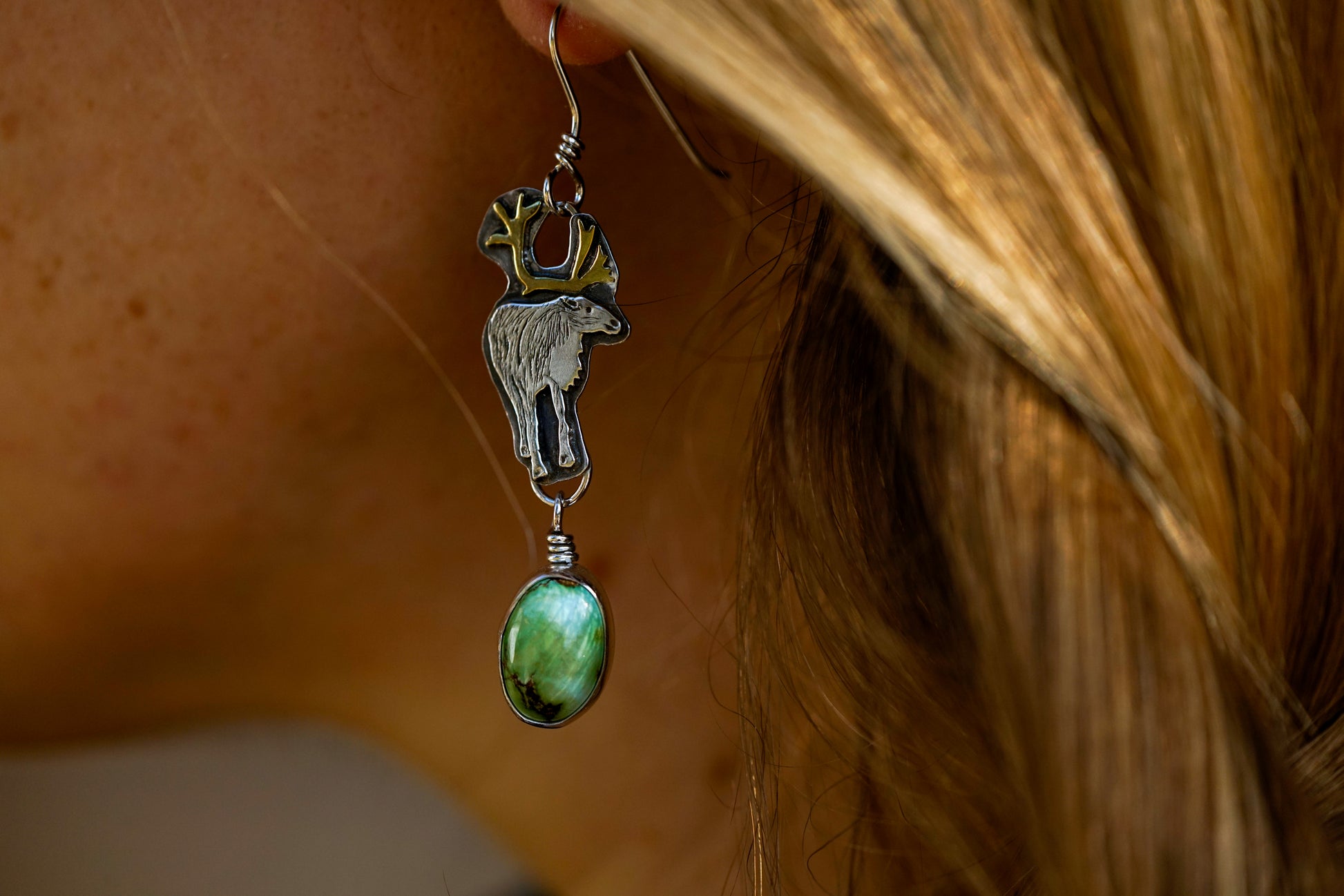 These asymmetrical caribou earrings are handmade from sterling silver with brass details and feature Sonoran Gold Turquoise stones. Each caribou starts out as simple sterling silver wire & sheet from which I saw out and assemble multiple layers. Then I add little details through stamping, engraving, sawing, drilling and patina to bring each caribou to life.