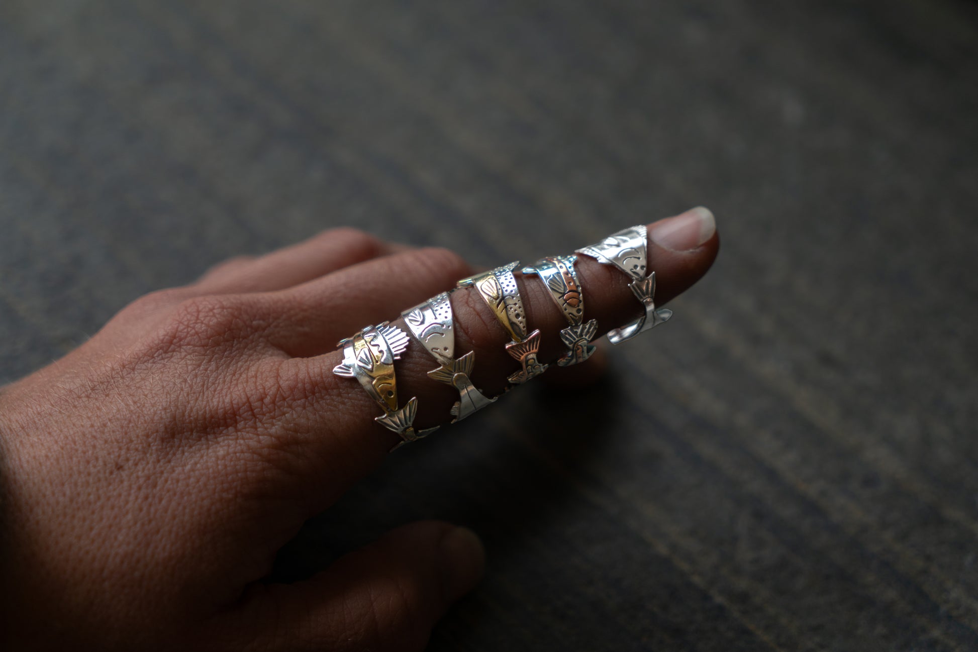 Every ring is handmade and each fish starts out as simple sterling silver, copper, and/or brass sheet from which I saw out and assemble multiple layers. Then I add little details through stamping, engraving, sawing, drilling and patina to bringing each fish to life!