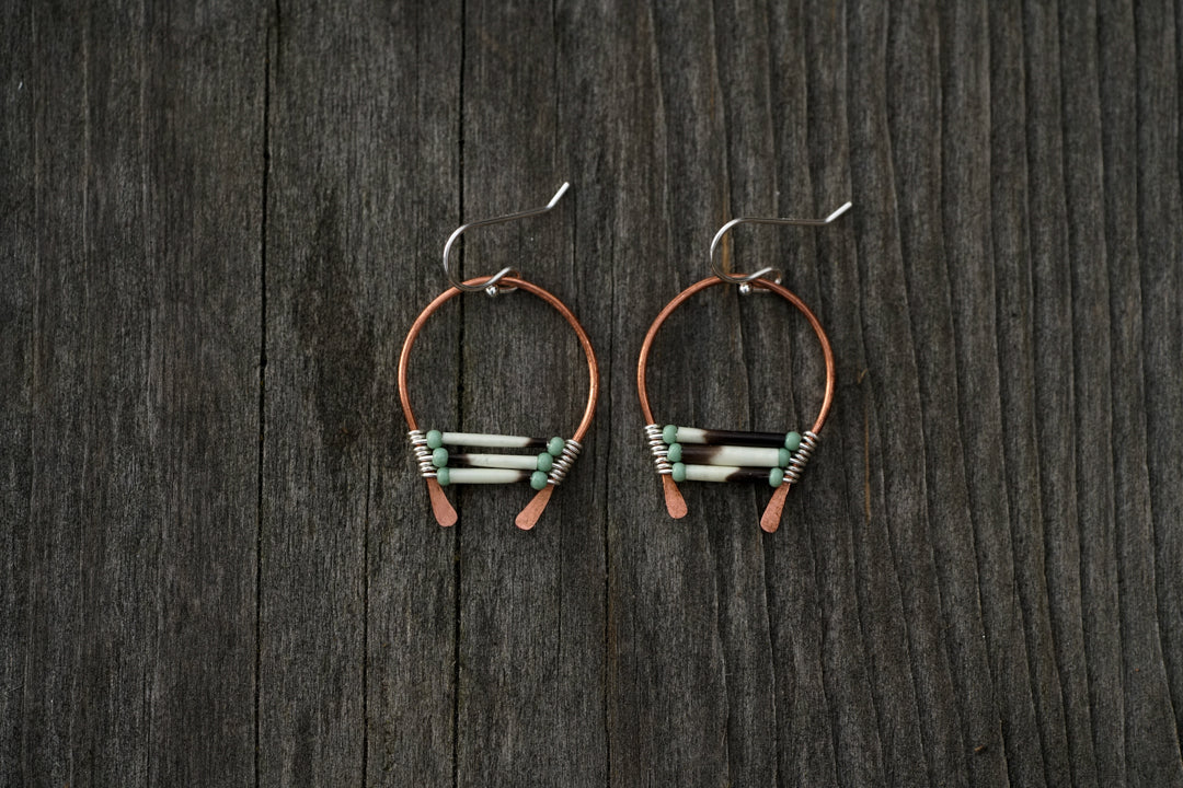 These triple quill arches are simple, elegant, and lightweight. They are made with locally collected porcupine quills, a couple beads to add a pop of color, and wrapped onto a cooper arch. Ear wires are sterling silver.