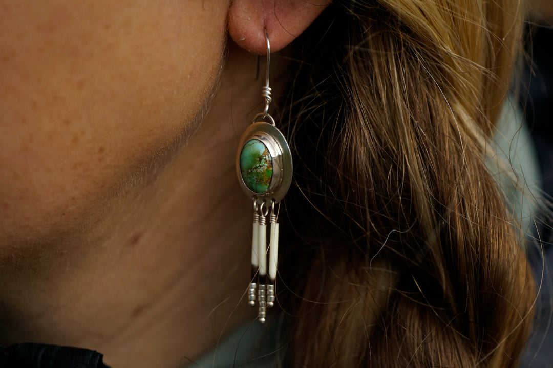These earrings are handmade from sterling silver with beautiful Sonoran Gold green turquoise stones and playful porcupine quill fringe