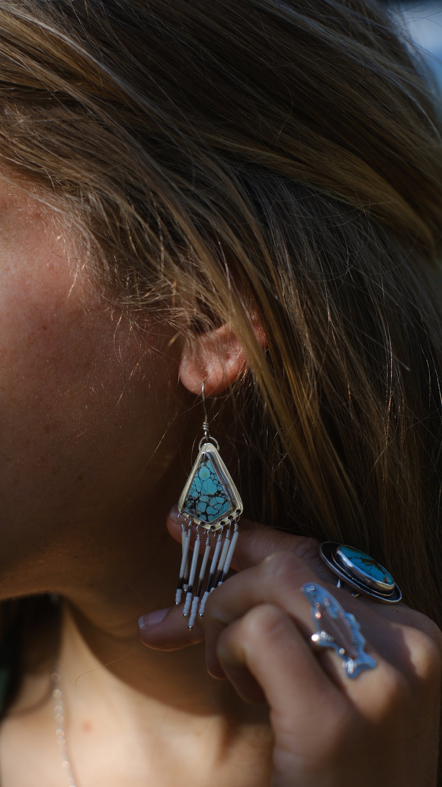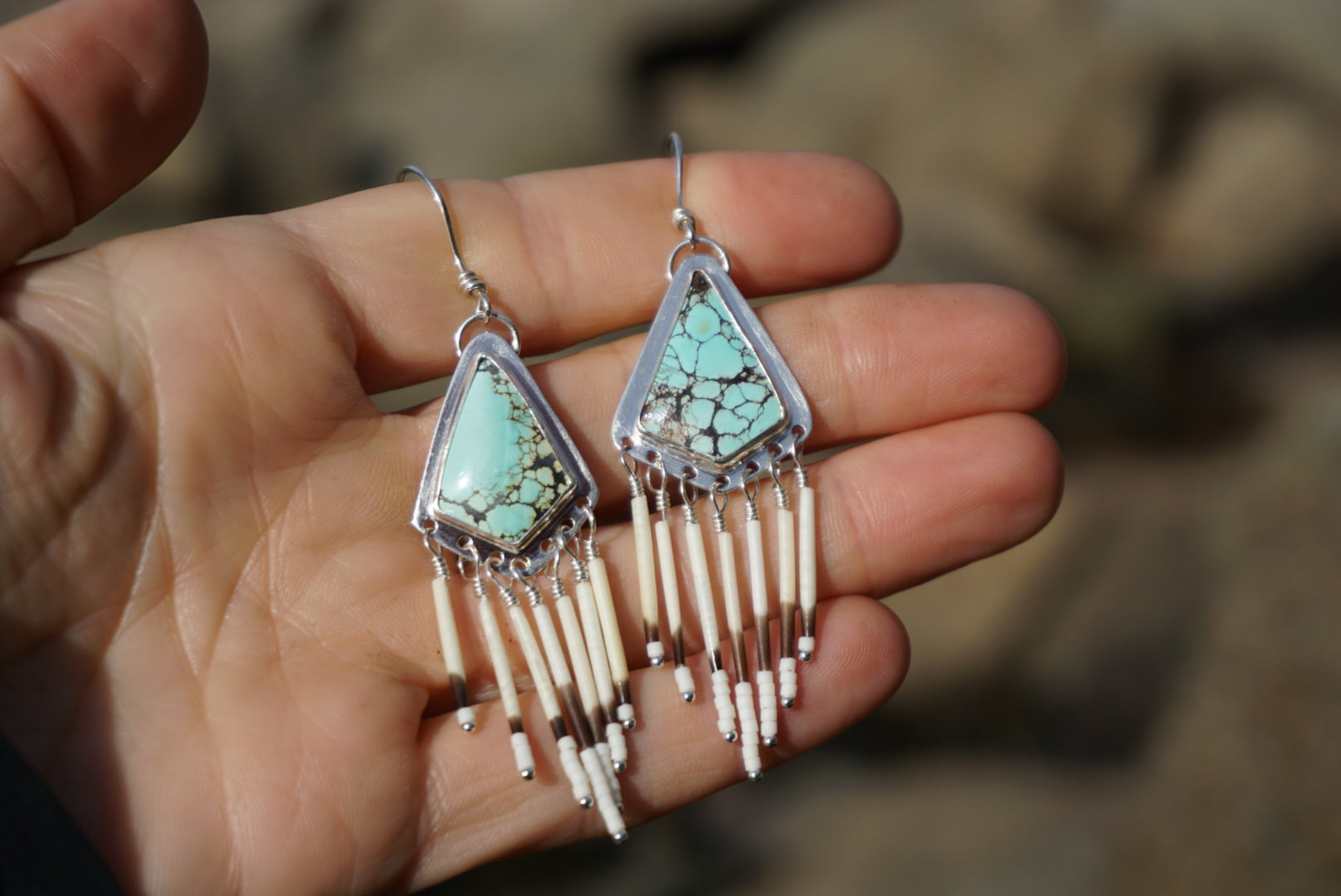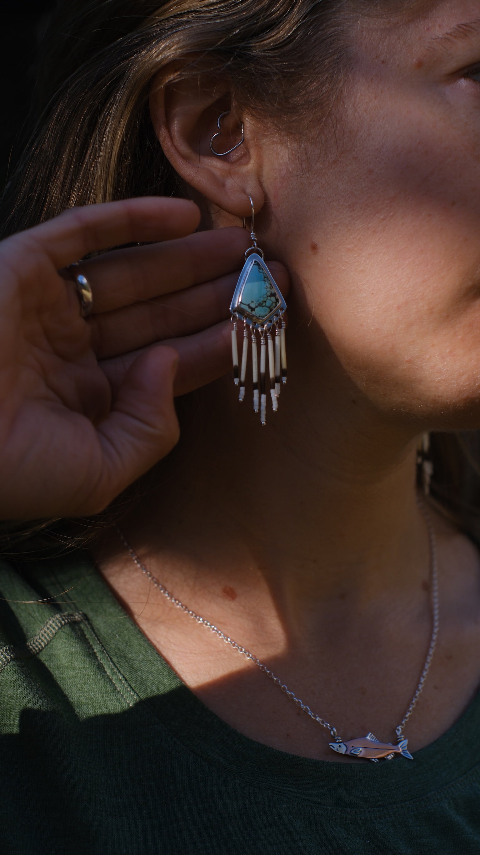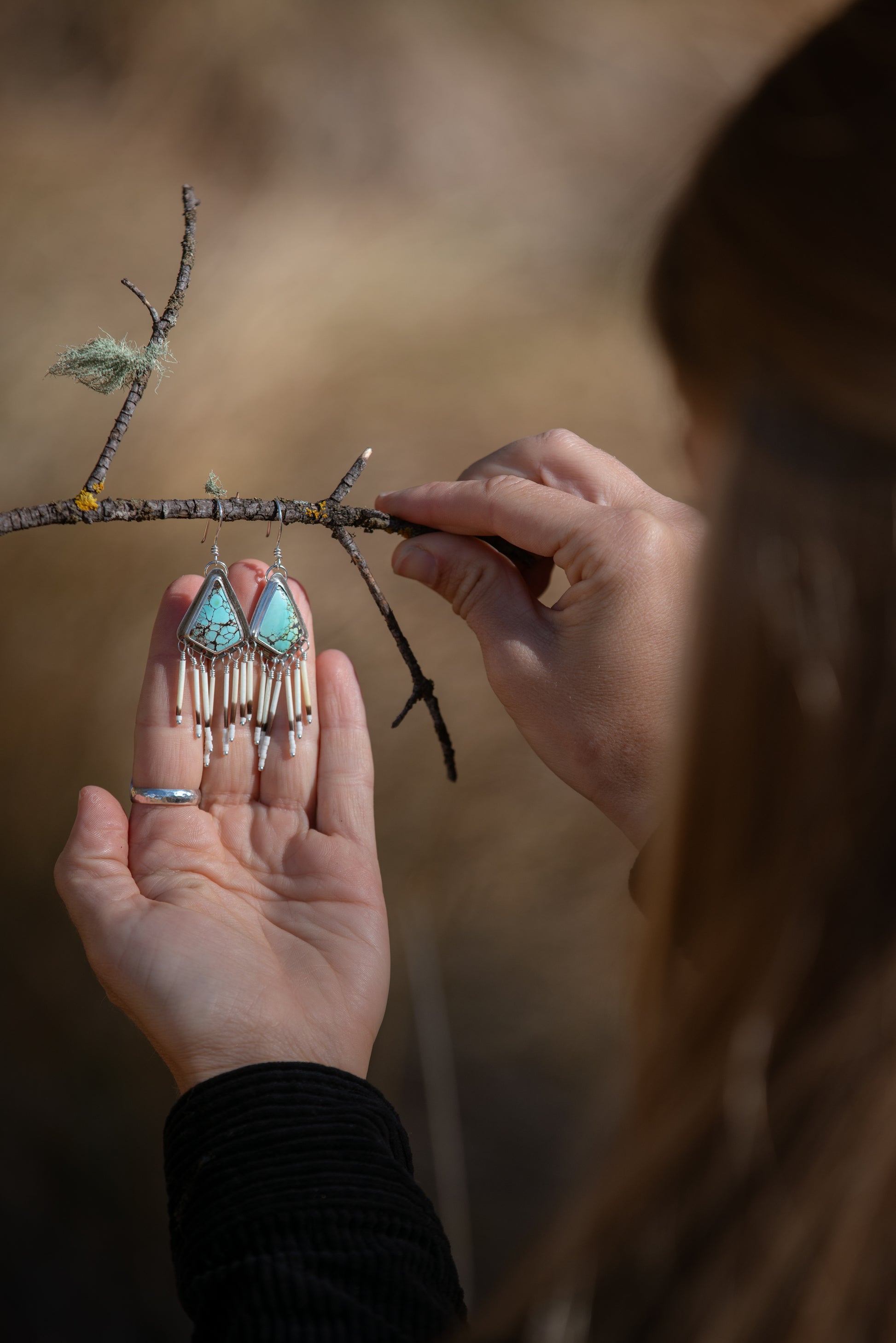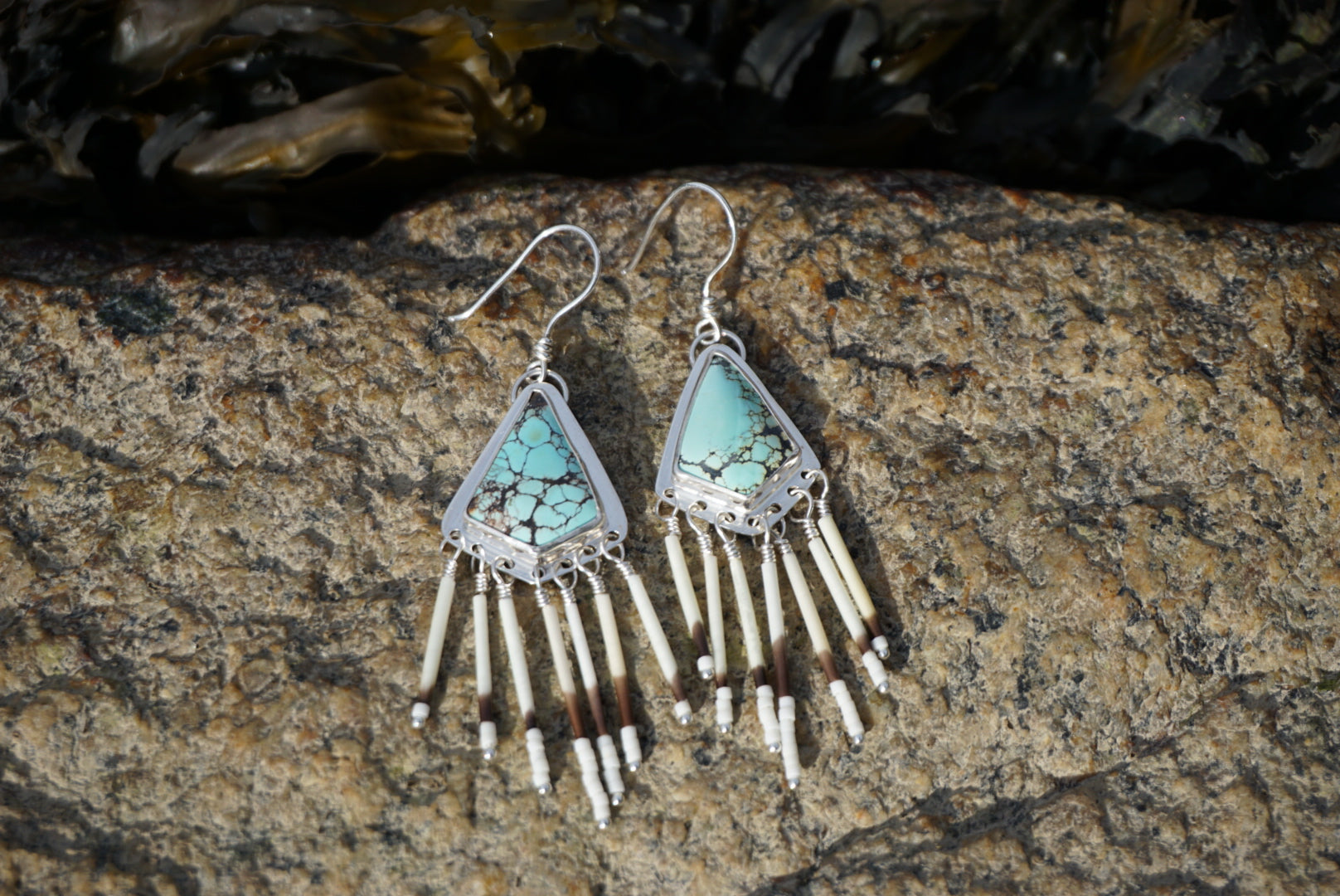 Stunning and unique, these earrings are handmade from sterling silver with beautiful Yungai turquoise stones and locally collected porcupine quill fringe