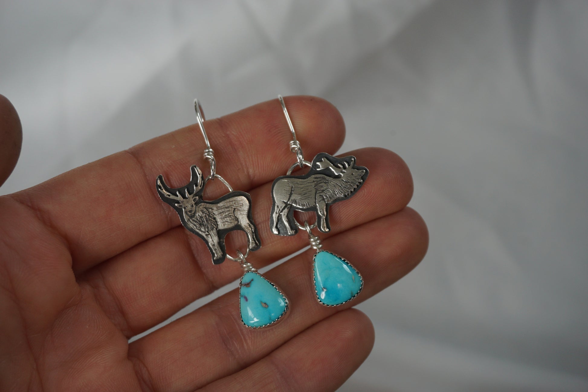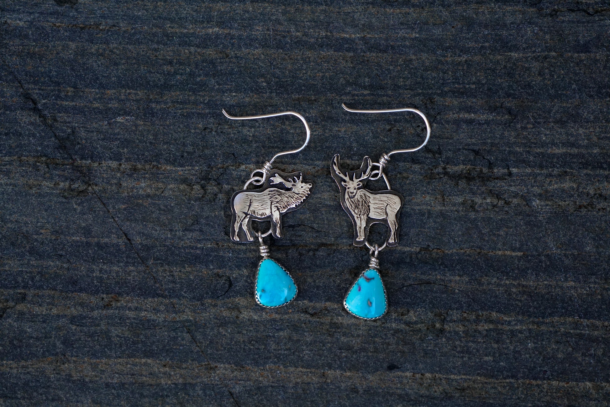 These asymmetrical elk earrings are handmade from sterling silver and feature Blue Ridge Turquoise stones. Each elk starts out as simple sterling silver wire & sheet from which I saw out and assemble multiple layers. Then I add little details through stamping, engraving, sawing, drilling and patina to bring each elk to life.