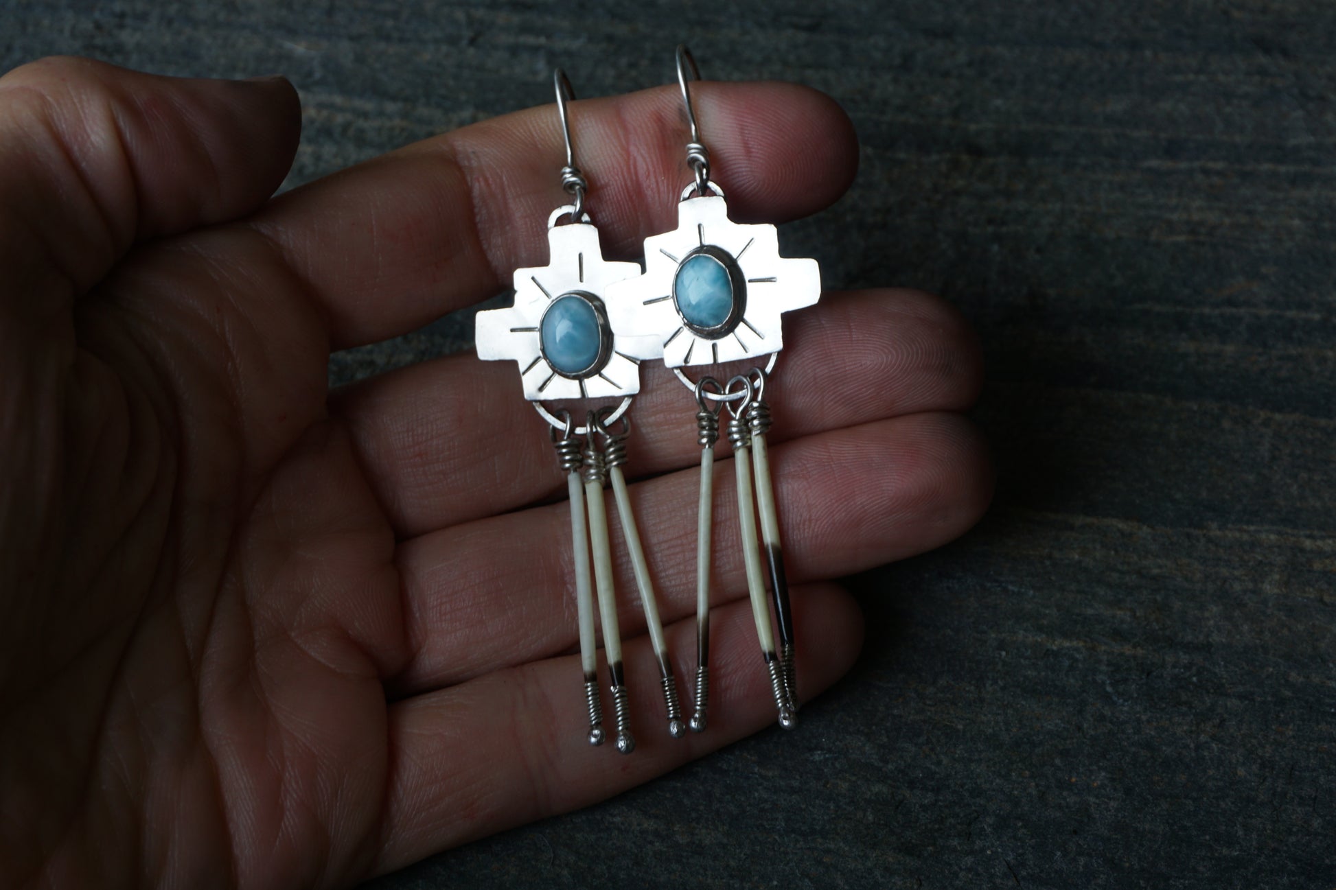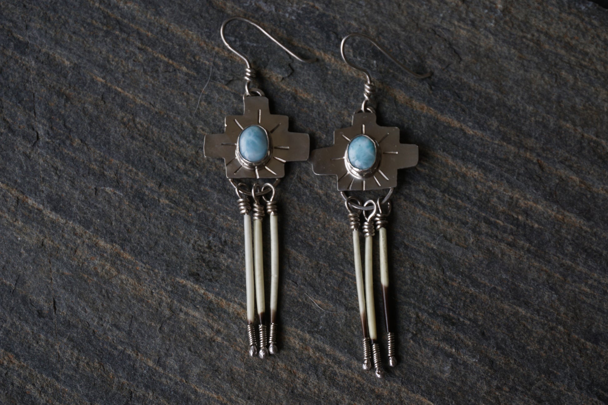 Handmade sterling silver earrings with Larimar stones and locally collected porcupine quill fringe.