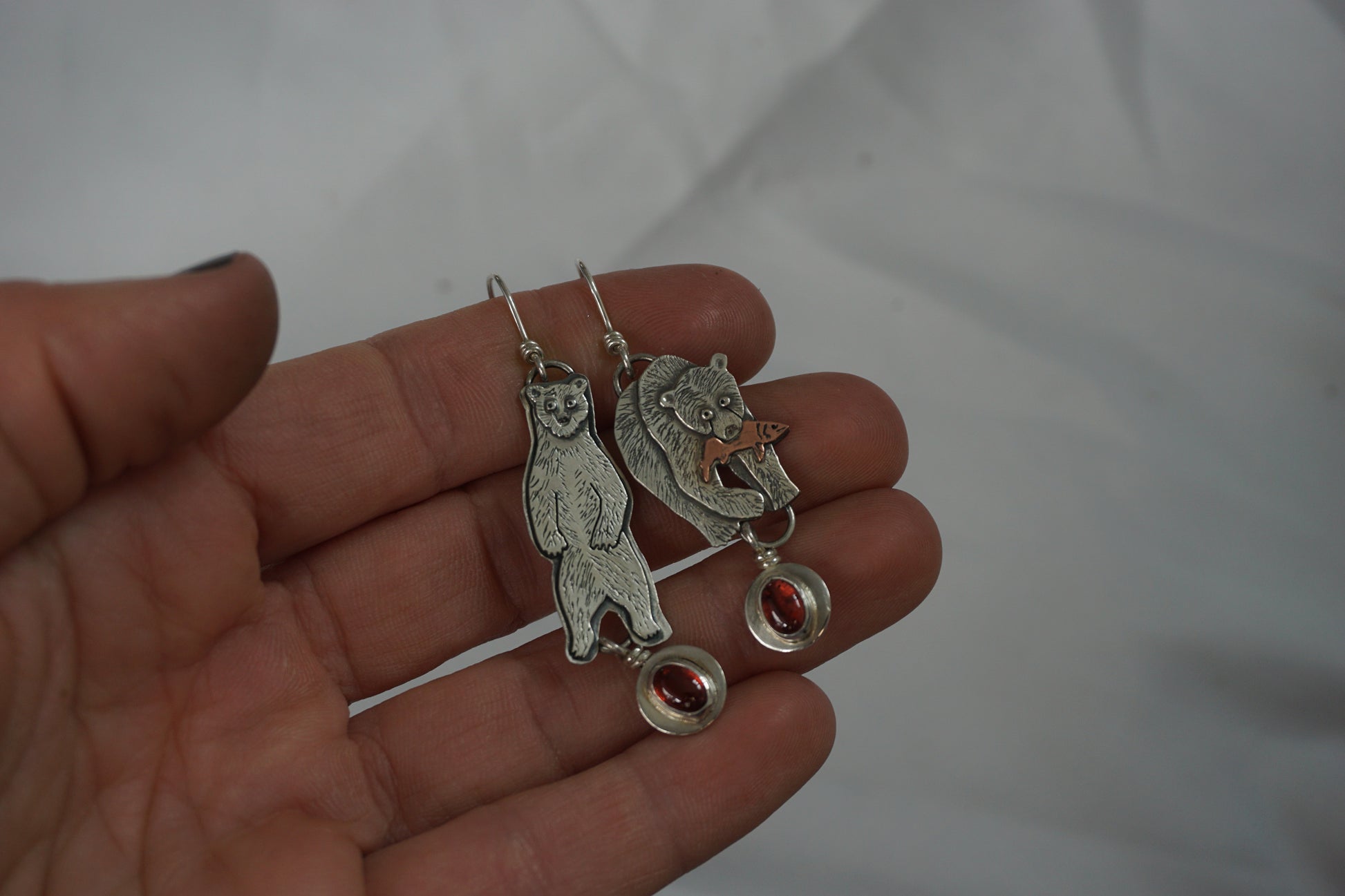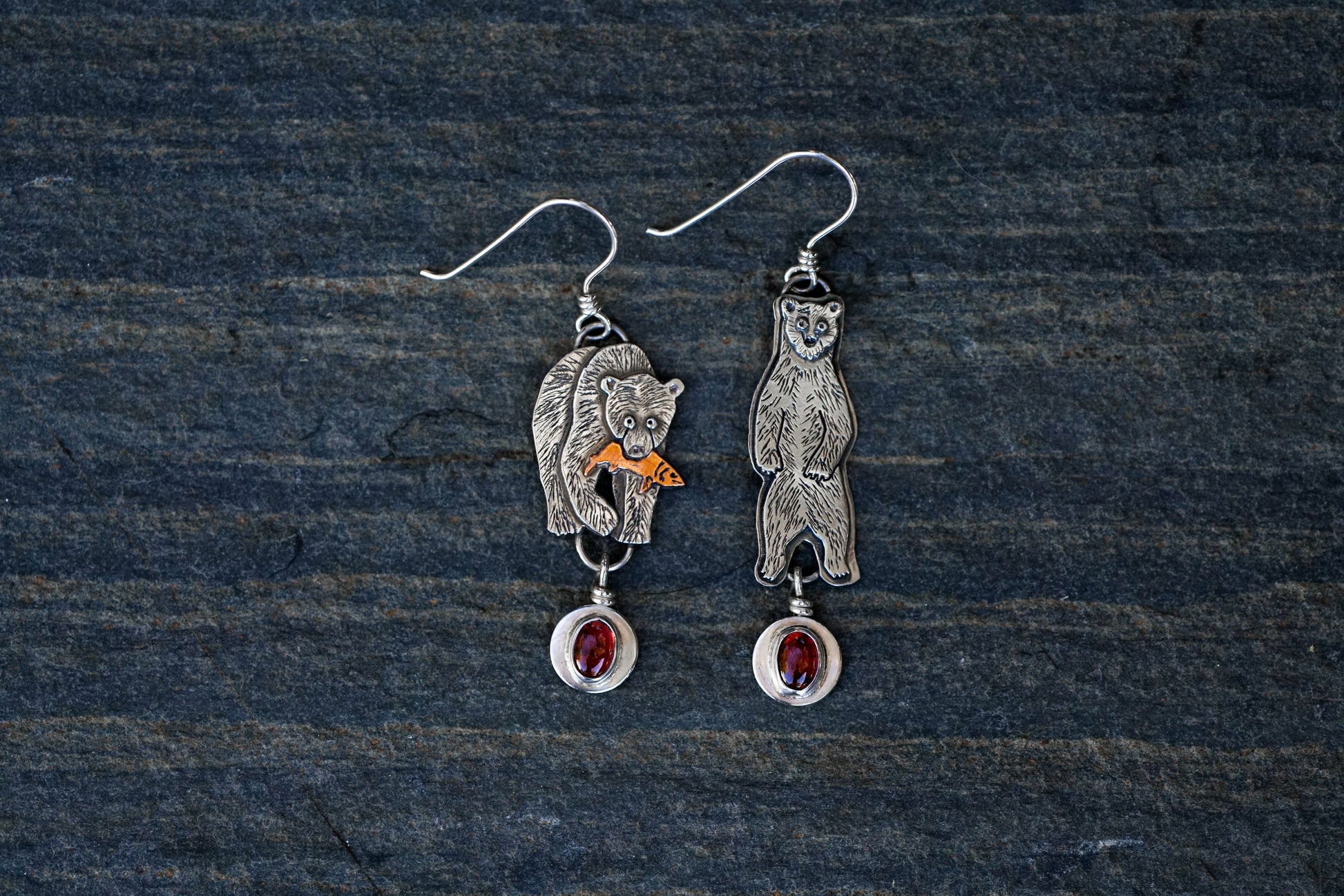 These asymmetrical grizzly bear earrings are handmade from sterling silver and feature Garnet stones. Each bear starts out as simple sterling silver wire & sheet from which I saw out and assemble multiple layers. Then I add little details through stamping, engraving, sawing, drilling and patina to bring each bear to life.