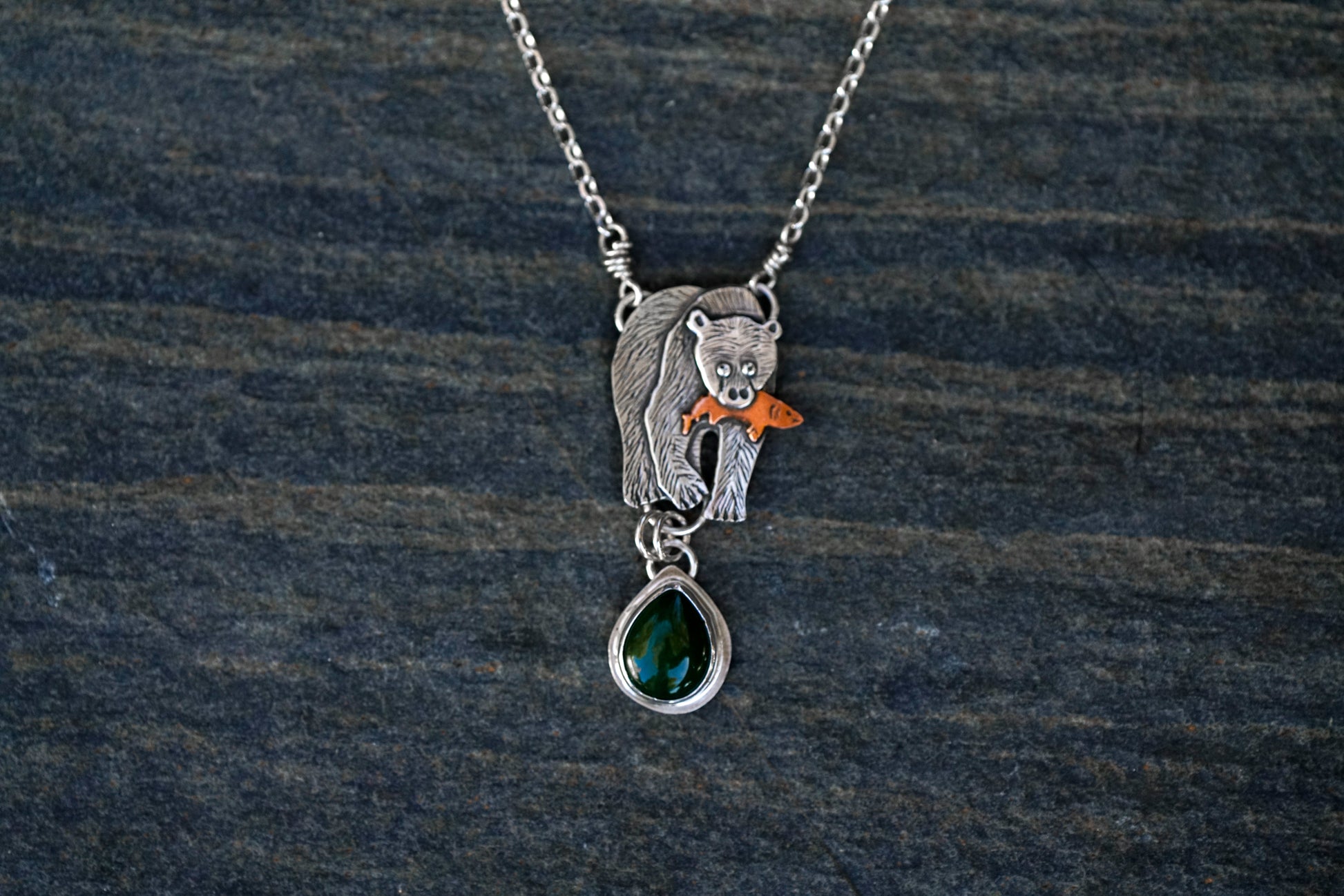 This grizzly bear necklace is handmade from sterling silver and features a jade stone with a salmon cut out on the back. This grizzly bear started out as simple sterling silver wire & sheet from which I sawed out and assembled multiple layers - including a copper salmon. Then I add little details through stamping, engraving, sawing, drilling and patina to bring it to life.