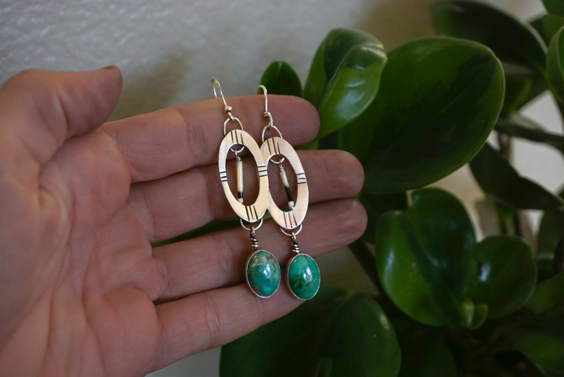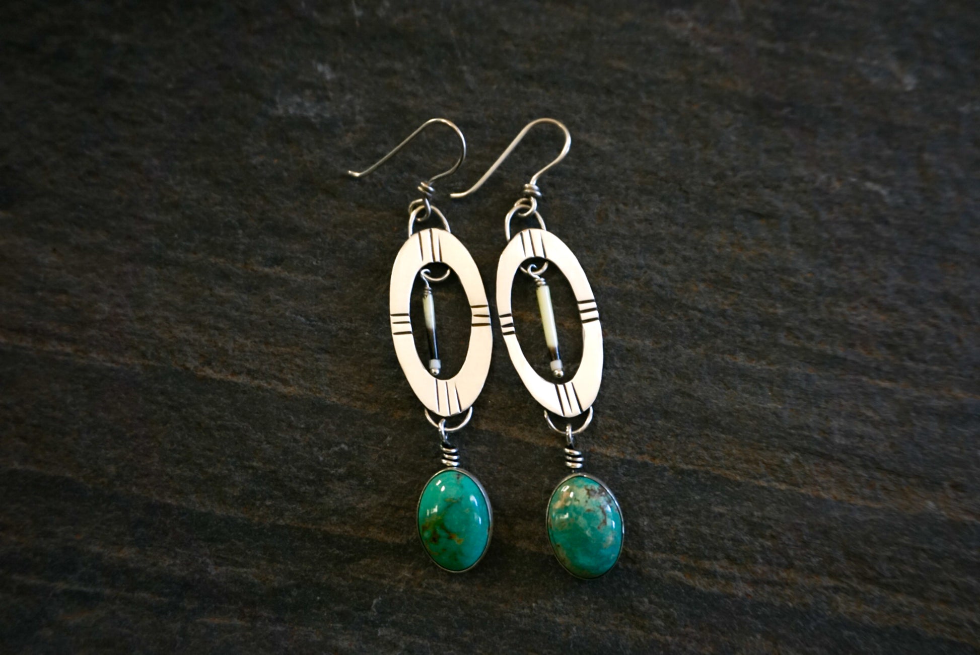 Stunning and unique, these earrings are handmade from sterling silver with beautiful blue-green turquoise stones and a playful porcupine quill dangle