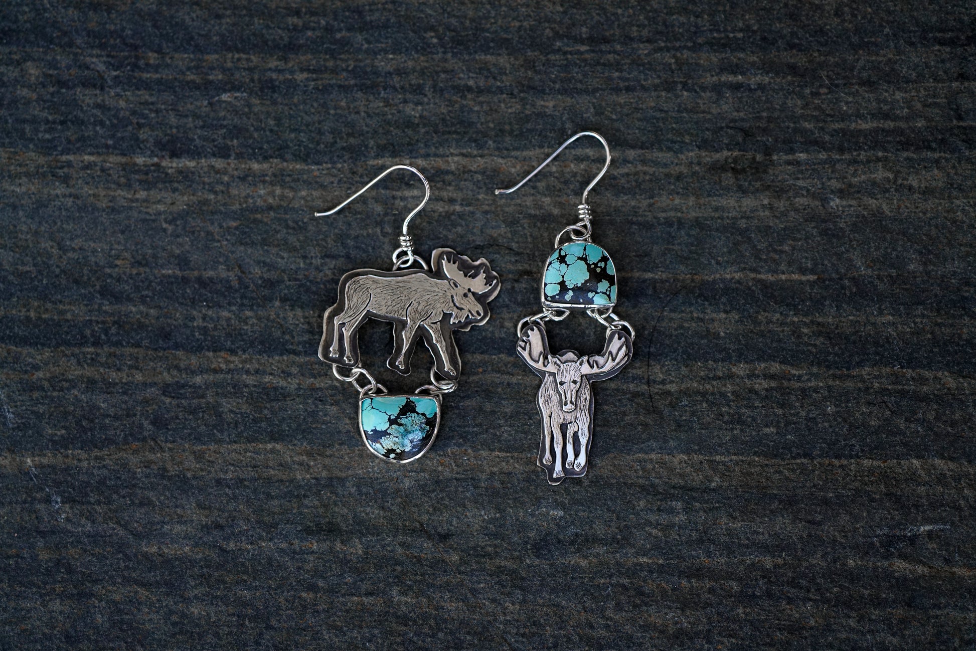 These asymmetrical moose earrings are handmade from sterling silver and feature Wild Horse Turquoise stones & brass details. Each moose starts out as simple sterling silver wire & sheet from which I saw out and assemble multiple layers. Then I add little details through stamping, engraving, sawing, drilling and patina to bring each one to life.