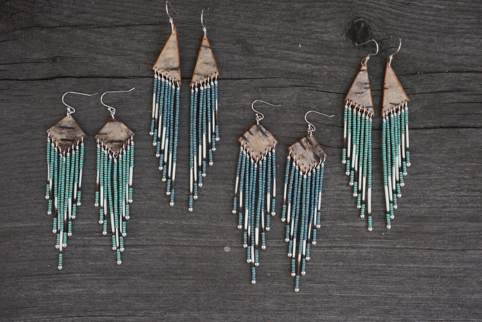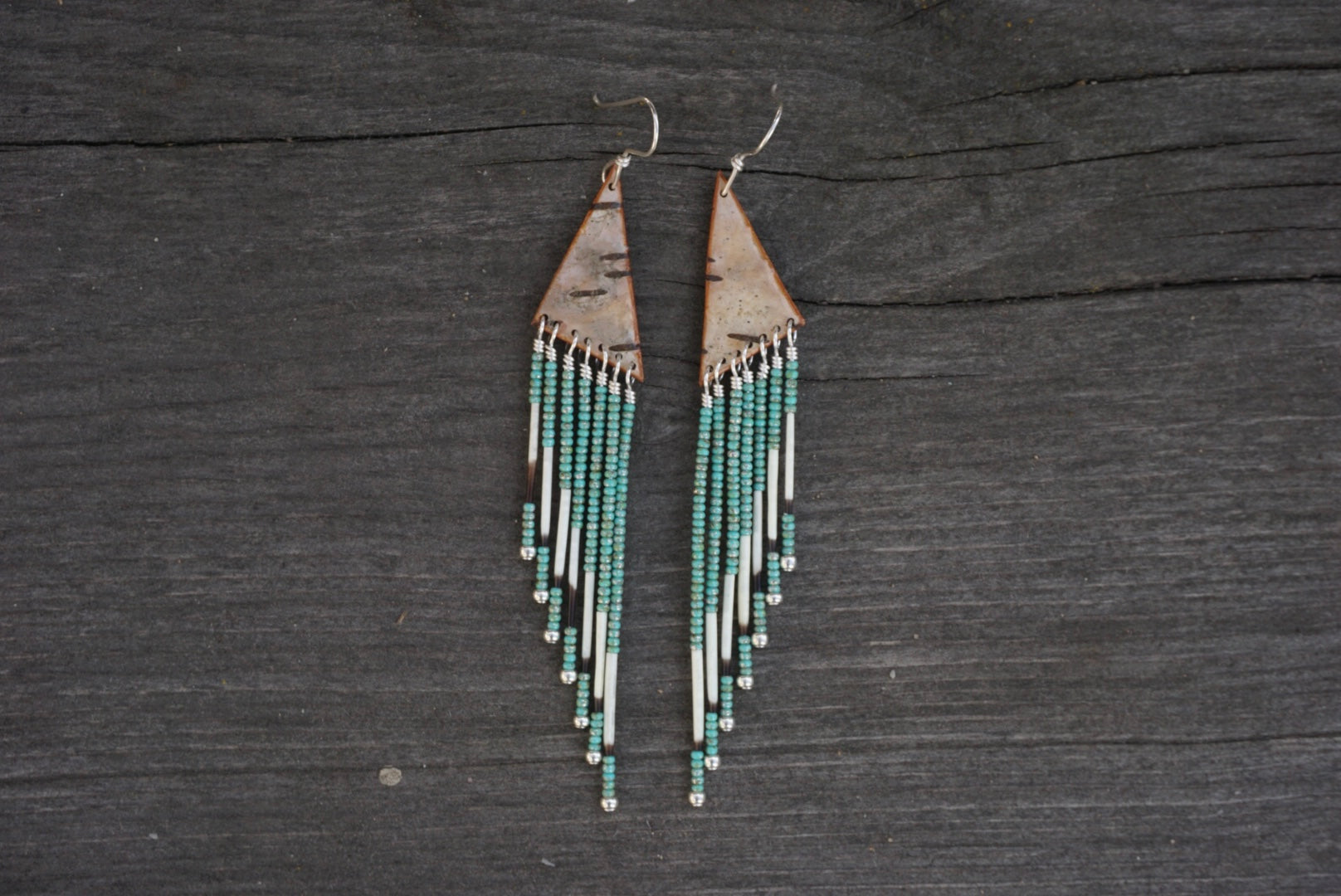 The Ferebee Fringe are back with new shapes! Playful, fun and lightweight, these earrings are made with birch bark that is sealed with an epoxy to hold up to wear with beads & porcupine quill fringe at the base. Ear wires are sterling silver.