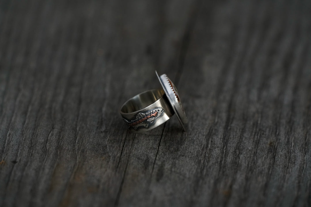 This ring features a colorful, almost trout-like, Ocean Jasper stone and a wide sterling silver ring band with two small rainbow trout, complete with copper accents and little details to bring them to life.