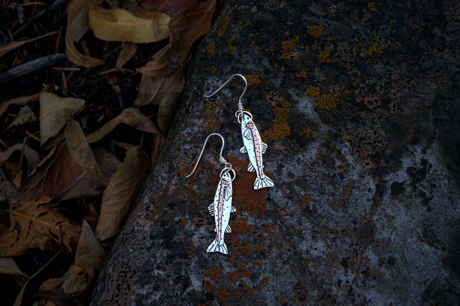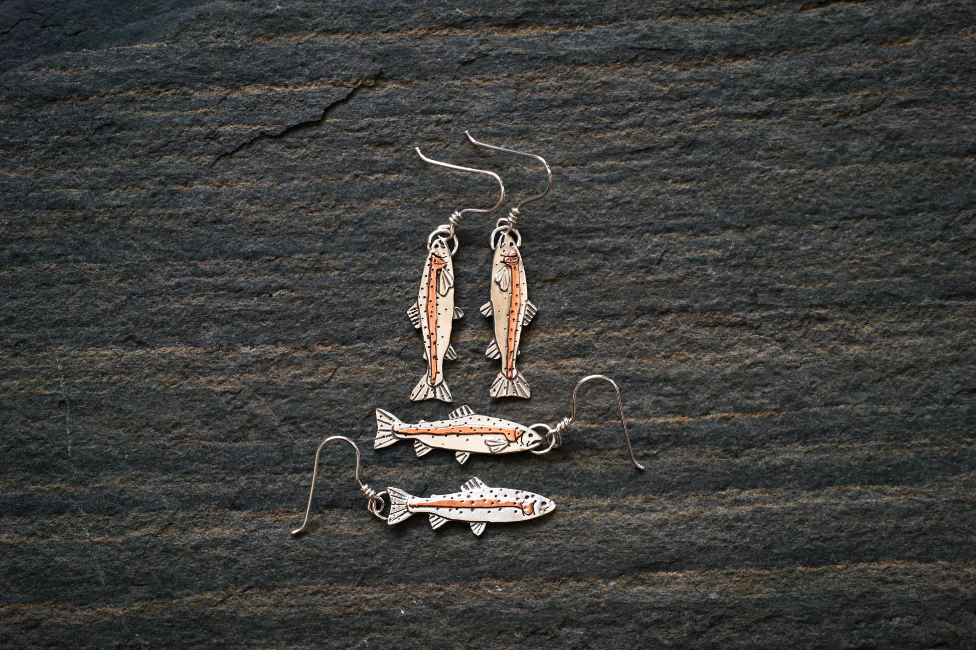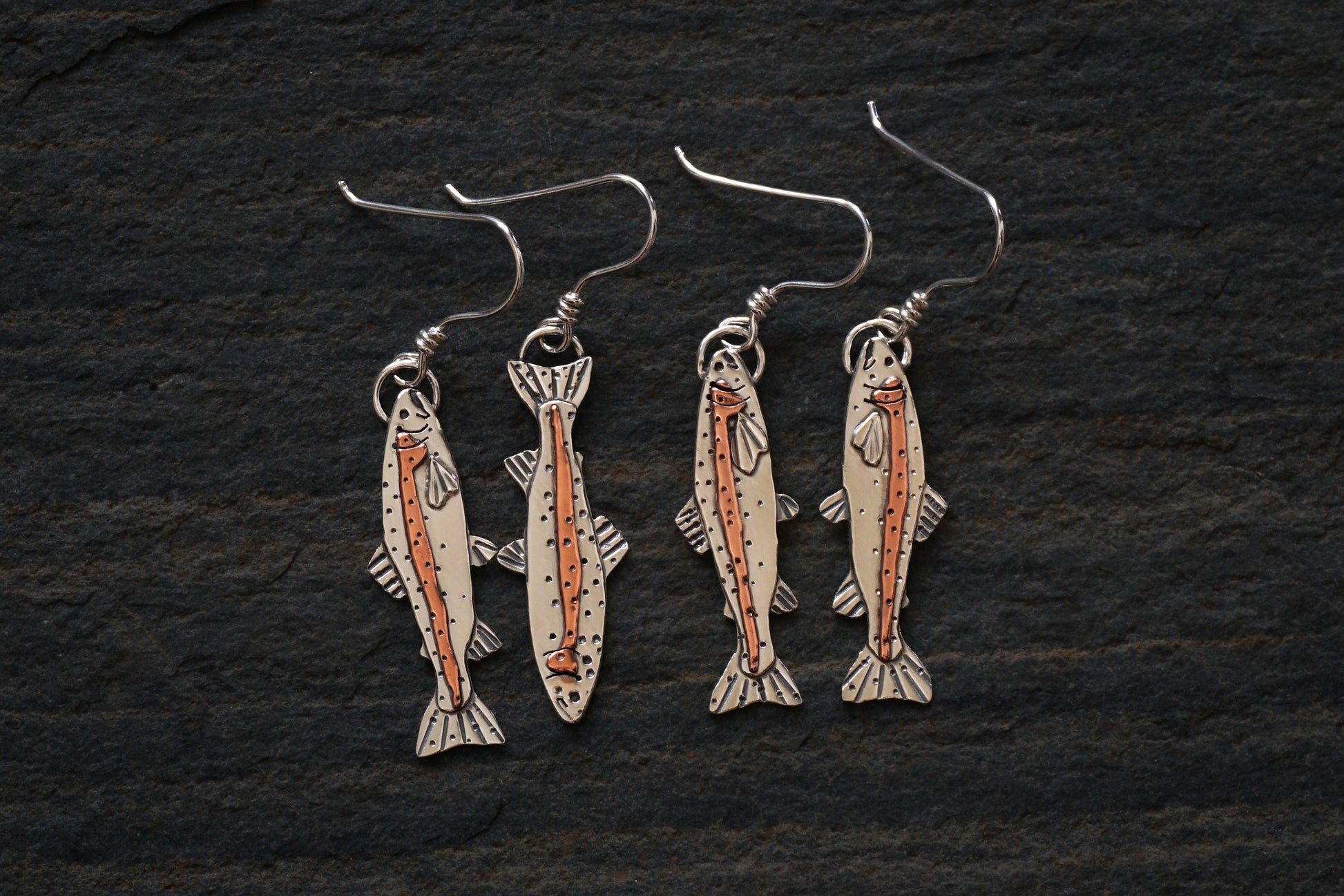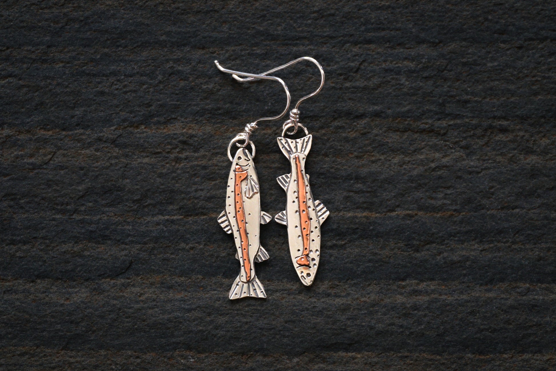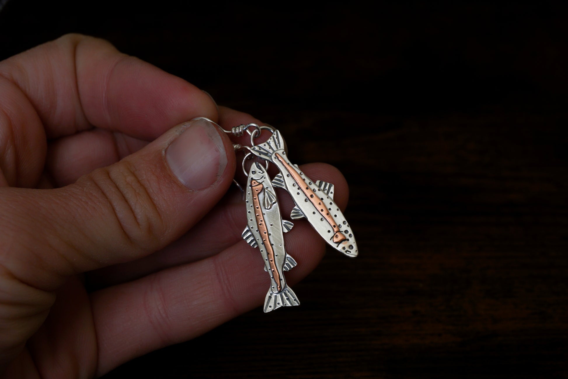 These Rainbow Trout earrings are handmade from sterling silver with copper details. Each fish starts out as simple sterling silver/copper sheet from which I saw out and assemble multiple layers. Then I add little details through stamping, engraving, sawing, drilling and patina to bring each trout to life.