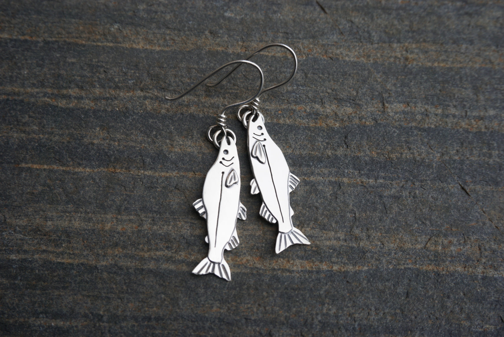 The Coho (Silver) Salmon. These earrings are handmade with each salmon starting out as simple sterling silver sheet and wire. I saw out and assemble multiple layers, adding little details through stamping, engraving, sawing and drilling to bring each salmon to life and add characteristics unique to each of the five species. Then I solder them all together, secure it to handmade earwires and polish them up.