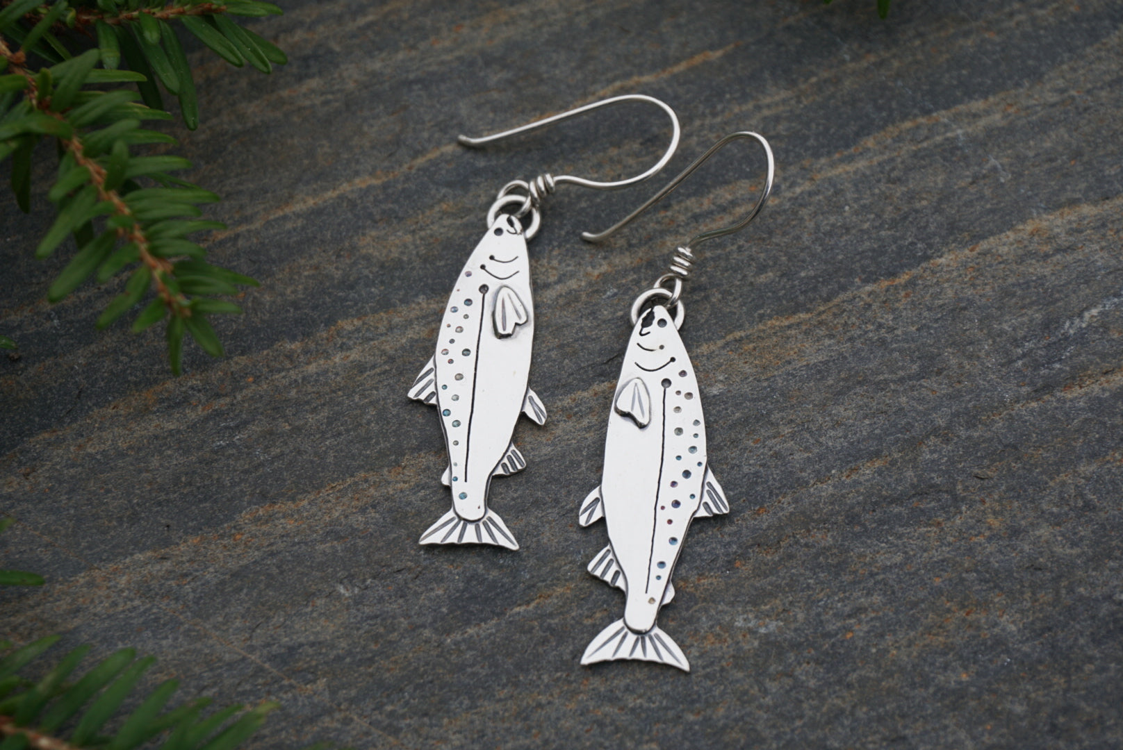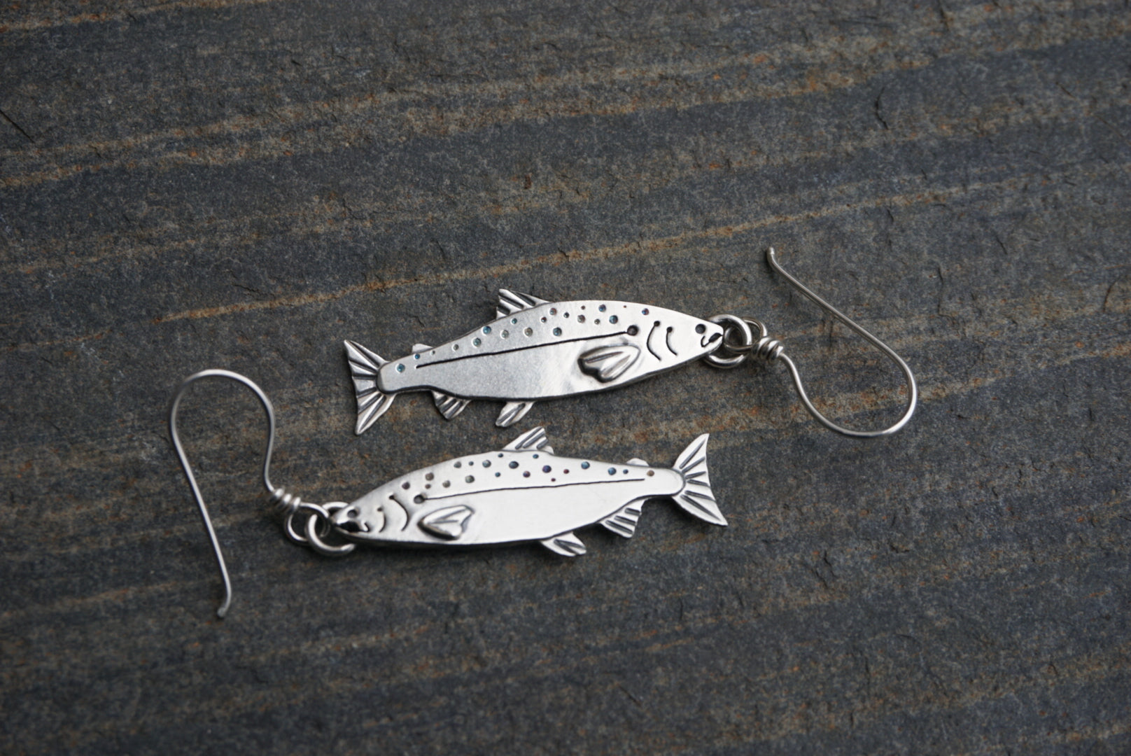 The King (Chinook) Salmon. These earrings are handmade with each salmon starting out as simple sterling silver sheet and wire. I saw out and assemble multiple layers, adding little details through stamping, engraving, sawing and drilling to bring each salmon to life and add characteristics unique to each of the five species. Then I solder them all together, secure it to handmade earwires and polish them up.