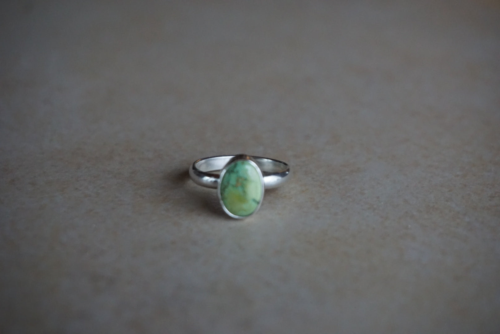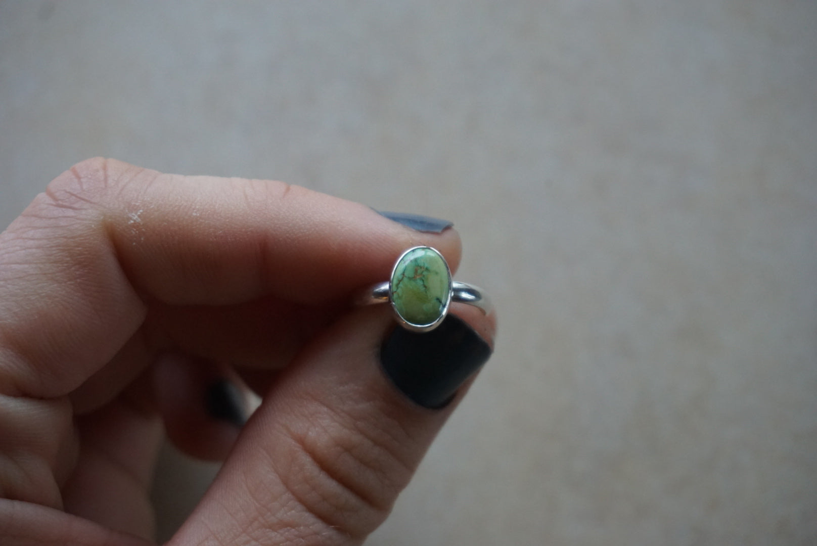 Simple sterling silver handmade ring with a beautiful blue-green Sonoran Gold turquoise stone. Dress it up with some stackers!