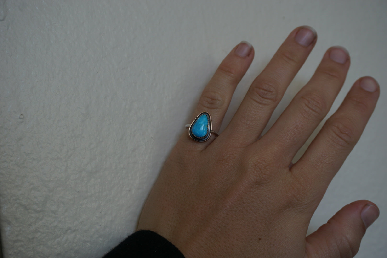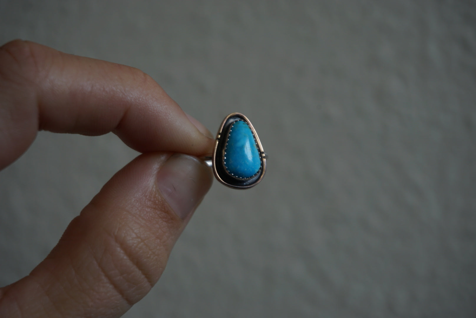 Handmade sterling silver ring with a Sonoran Mountain turquoise stone, 14k gold wire border, and patina to create a shadow box look.