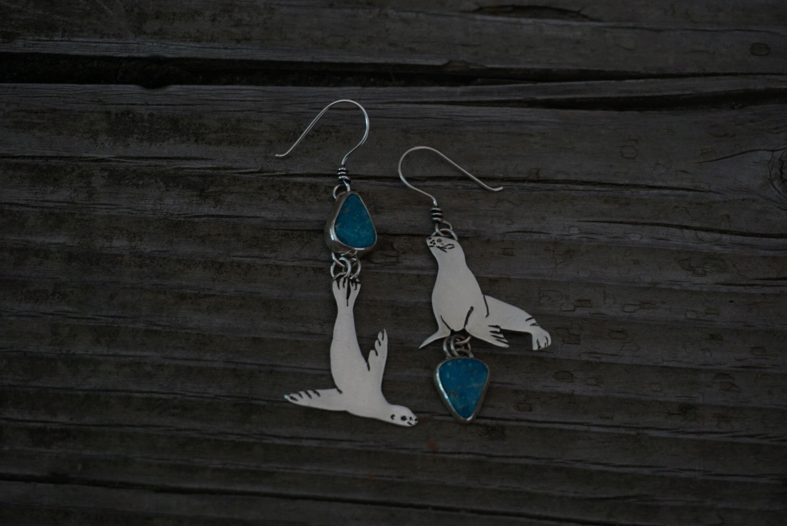 These handmade Stellar Sea Lion earrings are crafted from sterling silver and feature intricate hand engraving with added patina to bring them to life. Each earring showcases a Blue Ridge Turquoise stone.