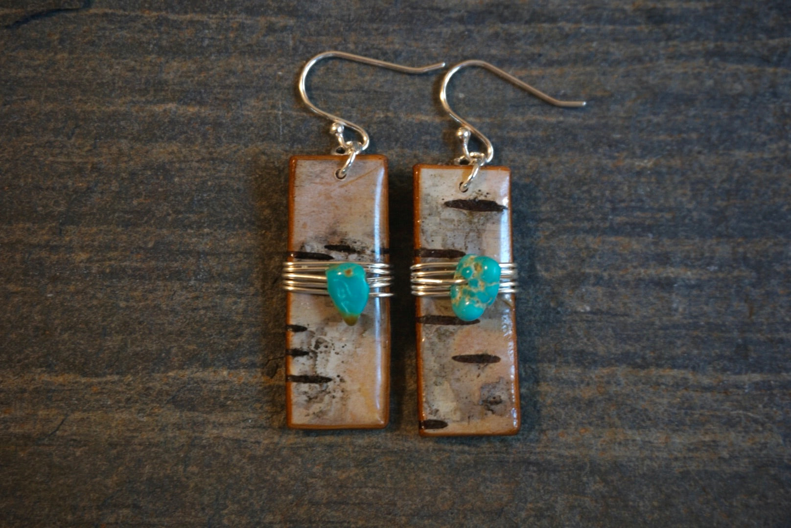 Named after the glacial blue waters of the mighty Taiya River, these lightweight danglers are the first style of earrings I made when I was getting started back in 2016. Birch bark my favorite material to work with. Every piece is so unique from its colors and patterns to the mosses and lichens growing on it. All birch bark is gathered from pieces on the ground or downed and dead trees then hand cut and sanded to shape. It is then sealed with an epoxy and hand wrapped with South Hill Turquoise beads. Earwires are sterling silver.