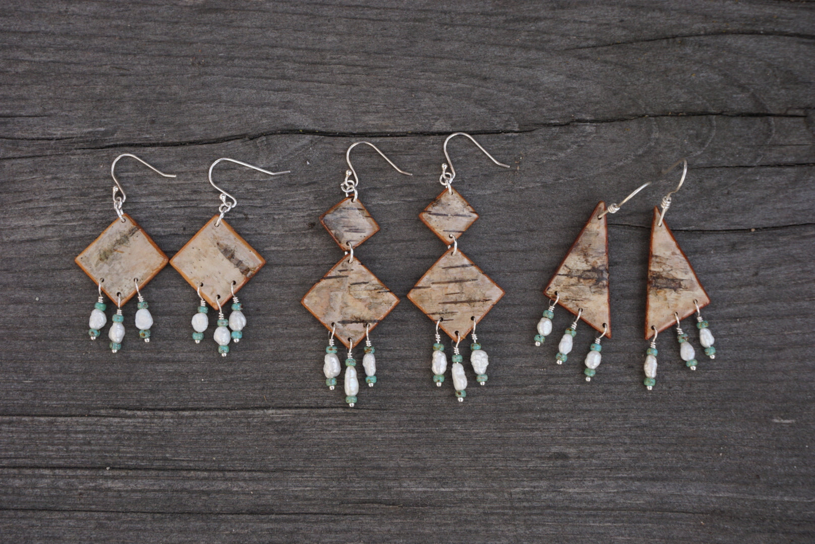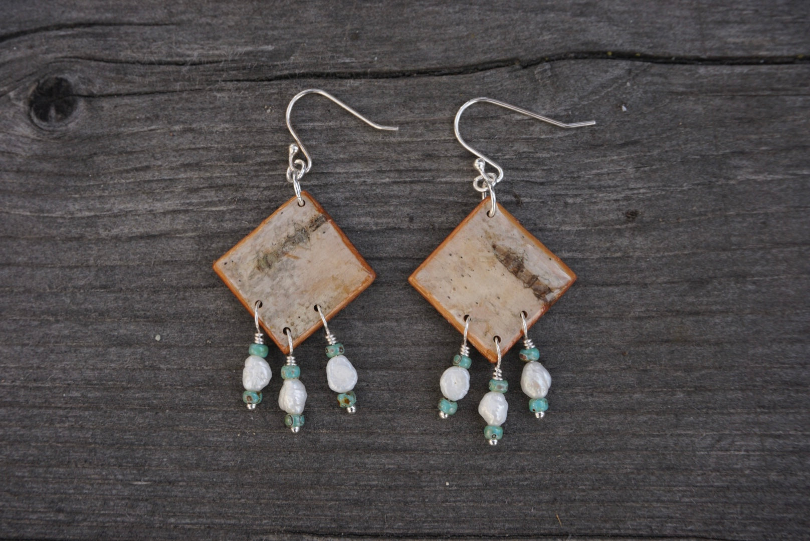Simple, fun and lightweight, these earrings are made with birch bark that is sealed with an epoxy to hold up to wear with fresh water pearl & turquoise colored bead fringe at the base. Ear wires are sterling silver.