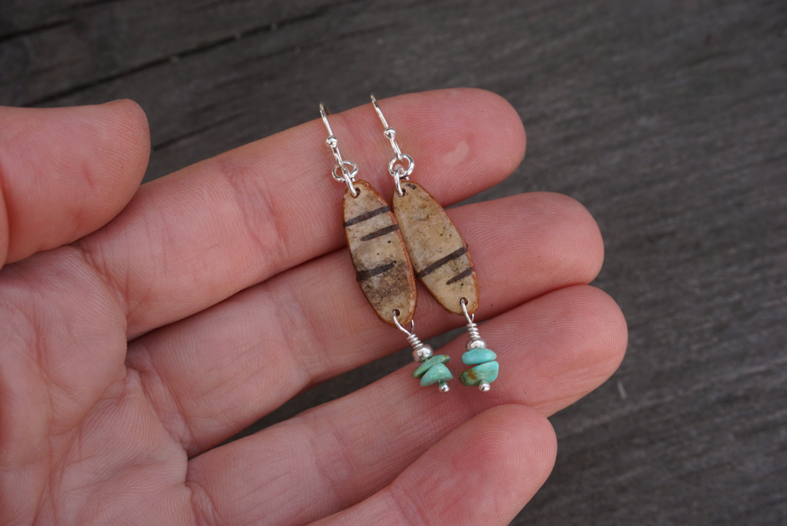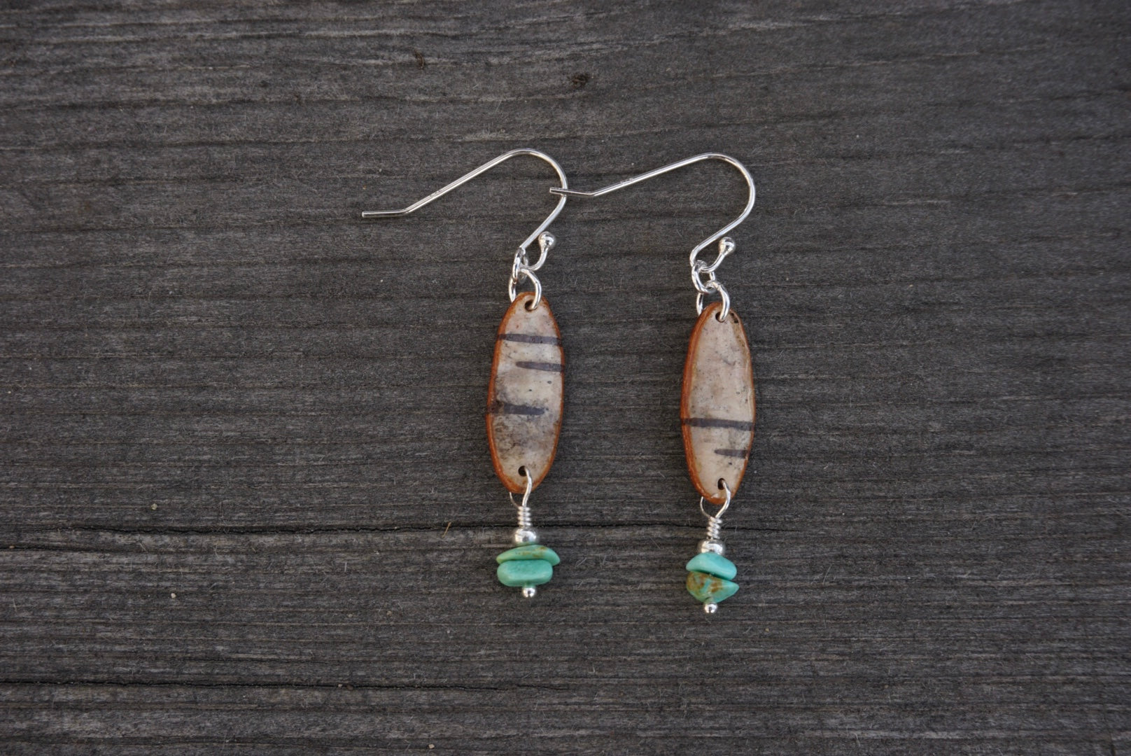 Playful, fun and lightweight, these earrings are made with birch bark that is sealed with an epoxy to hold up to wear with turquoise stone & silver beads at the base. Ear wires are sterling silver.