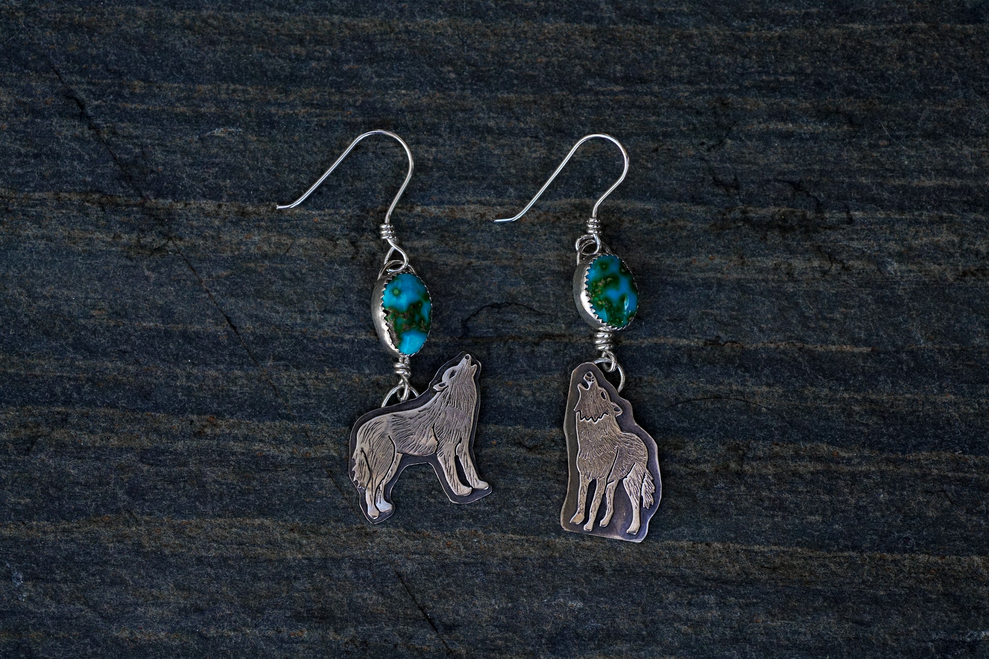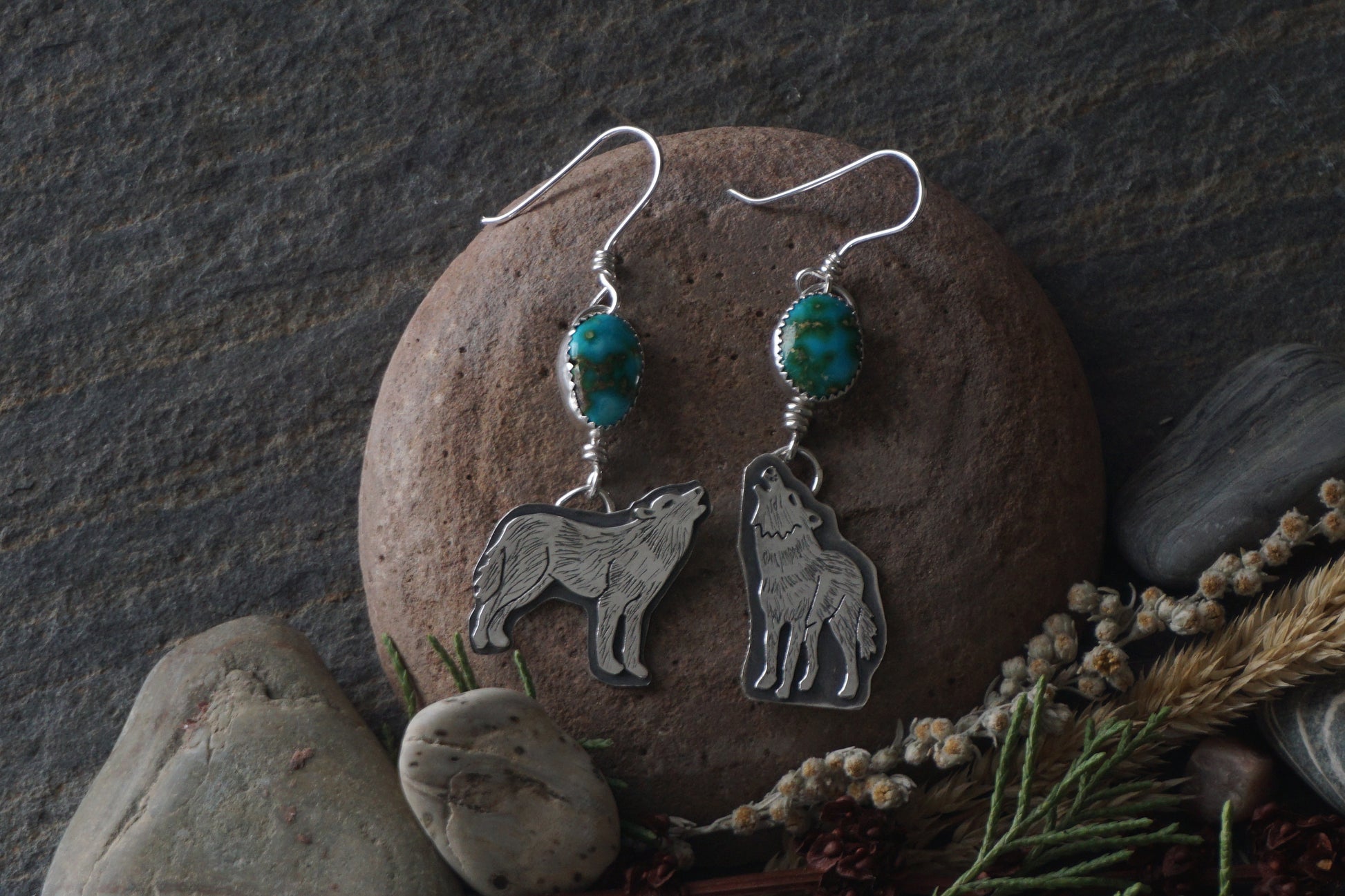These asymmetrical wolf earrings are handmade from sterling silver and feature Sonoran Mountain Turquoise stones. Each wold starts out as simple sterling silver wire & sheet from which I saw out and assemble multiple layers. Then I add little details through stamping, engraving, sawing, drilling and patina to bring each wolf to life.