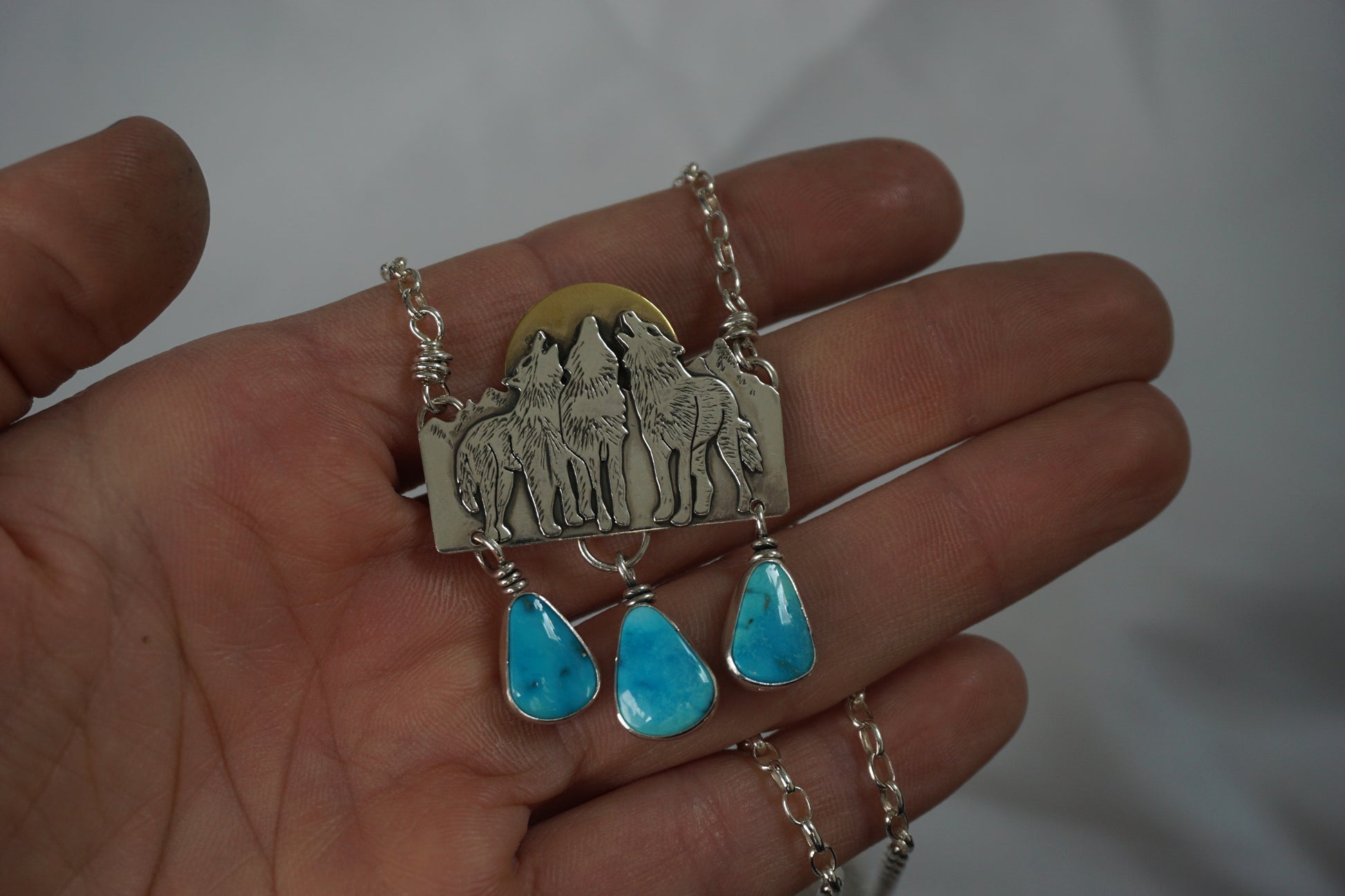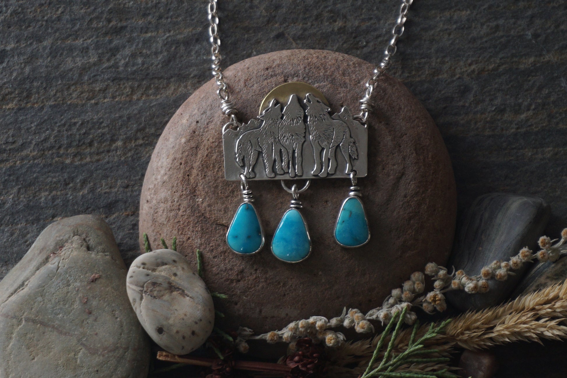This wolf pack necklace is handmade from sterling silver and features 3 Blue Ridge Turquoise stones and a brass moon. Each wolf starts out as simple sterling silver wire & sheet from which I saw out and assemble multiple layers. Then I add little details through stamping, engraving, sawing, drilling and patina to bring it to life.